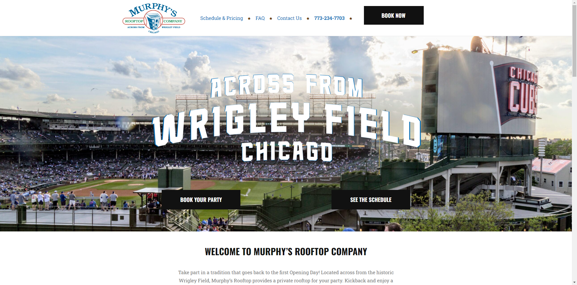 Murphy’s Rooftop is a website dedicated to promoting and booking of their private rooftop. It has been a long standing tradition for buildings located across from Wrigley Field to allow individual to watch games from the roof of the building. Located across from the historic Wrigley Field, Murphy’s Rooftop provides a private rooftop for your party Kickback and enjoy a ball game with your family, friends or coworkers with an all-inclusive food and drink package.