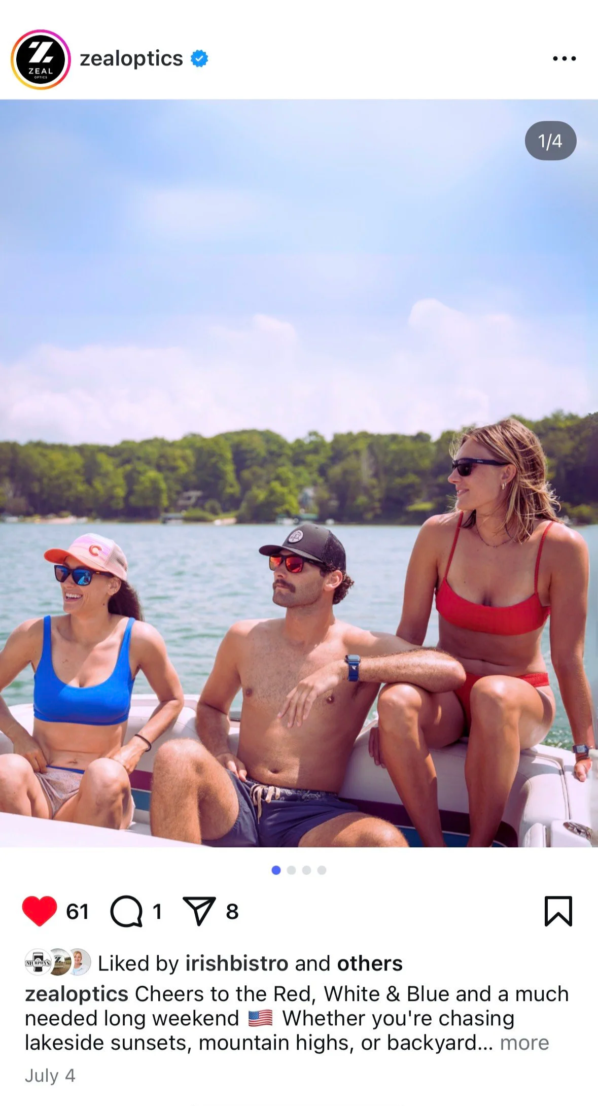 Below are just a few examples of the social media content I created while at Zeal Optics. This includes Instagram post such as Reels, Carousels and single image posts. My contribution to these post include 100% of the project, Ideation, production, filming, editing, song choice, posting, monitoring.